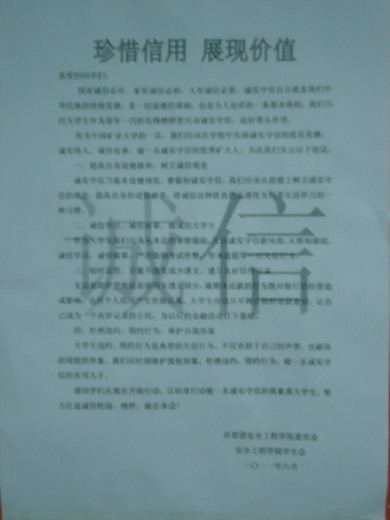 公告栏发布“珍惜信用,展现价值”倡议书,并在梅三宿舍楼大厅摆放诚信宣传宣传板,倡导天美传媒