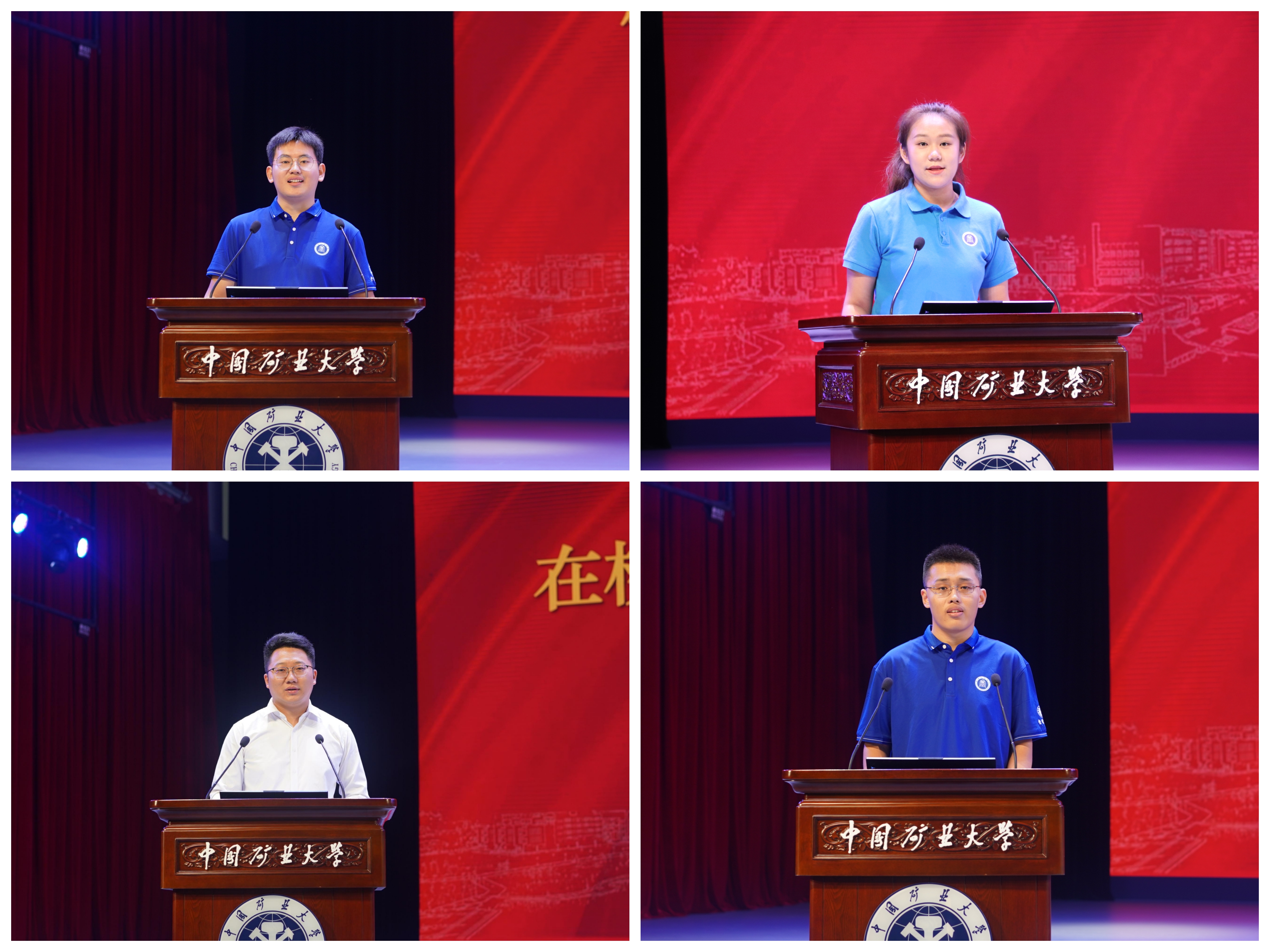 青年教师代表郭峰研究员结合自己在矿大求学及工作经历,勉励新生以终为始,用长远目标倒推关键子目标、规划自己的大学或者研究生生涯,学会独立思考、独立解决问题,培养独立人格。在校生代表2021级博士施宇分享了他在矿大求学八年中的感悟。他结合自己的成长轨迹,叮嘱学弟学妹,要坚守初心使命、磨练坚强意志,更要传承矿大精神,用一腔热血和担当回报父母,建设矿大,报效祖国。在校生代表职业卫生工程2021级1班安美颐同学结合自身专业学习感悟,鼓励新生可以保持一颗好奇的心,勇于尝试新事物,不畏失败,敢于在探索中发现自己真正的兴趣与潜能。新生代表2024级直博生毛紫浩讲述了自己选择留在天美传媒