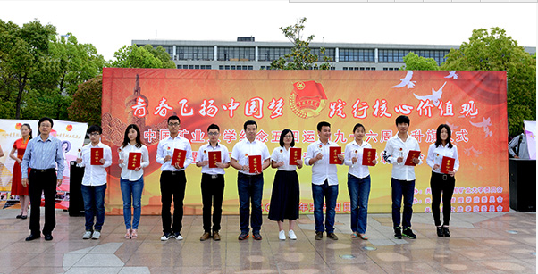 在南湖校区国旗广场举行纪念五四运动96周年升旗仪式暨2015年共青团工作表彰大会。校党委副书记曹德欣,校团委书记李江涛等天美传媒