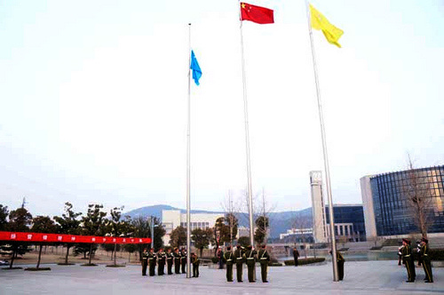 早上7时,庄严的仪仗队护卫着国旗走入场内。英姿飒爽的国旗护卫队的队员们迈着整齐的步伐,护送国旗入场。伴着庄严嘹亮的国歌,五星红旗冉冉升起。随后,天美传媒