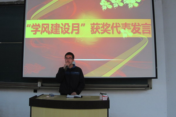 下午2时许,大会在热烈的掌声中拉开序幕,首先,院学生会学习部部长邓欢对“学风建设月”活动的开展情况及所取得的成果作了总结报告。随后,钱书记对在“学风建设月”活动中表现突出的先进集体以及在期中考试中分别获得一,二,三等奖的同学进行表彰与颁奖。颁奖仪式结束后,“学风建设月”获奖代表,安全11-3班的苏庆乐同学发表获奖感言以及个人近期学习心得,他说端正的态度和切实的行动是非常重要的。随后,安全09-4班班长、消防10-1班班长与11-1班班长也就学风建设月中本班的建设情况以及所取得的成果进行汇报。