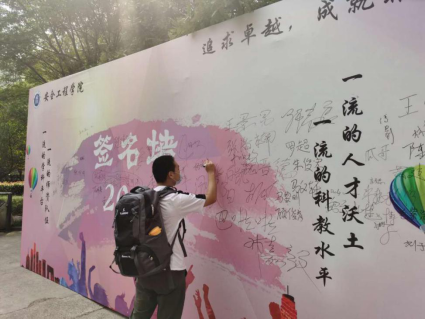 迎新引导点,在梅苑3号楼设置了新生签名留念墙,为2020级新生准备了“新路礼程”纪念礼包,为新生进入矿大留下美好回忆。9月13日早上6:30,来自新疆自治区的努尔扎提·艾尼完尔第一个到迎新点报到。他说:“能够来到矿大非常幸运与开心,也格外激动,一大早便迫不及待地等在校门外,满怀兴奋地期待着我的大学生活。”