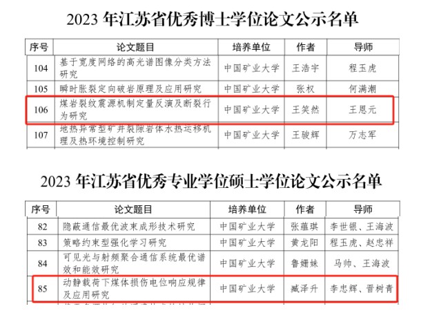 博士研究生王笑然(导师王恩元)的学位论文《煤岩裂纹震源机制定量反演及断裂行为研究》被评为2023年江苏省优秀博士学位论文;天美传媒