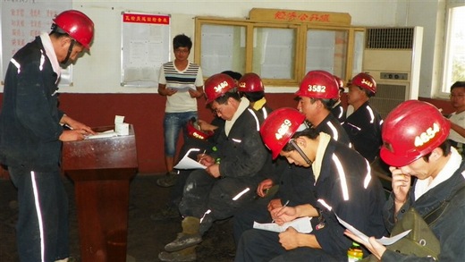 上午,实践团成员来到杨庄煤矿通风区,参加通风人员班前会,学习了矿工的各项理论技能。班前会起始,通风区领导就下井的任务、安全、纪律等注意事项做了强调指示。然后,通风队队长就各项工作和责任做了细致的分工并做了任务分配,工人们都认真聆听并仔细地在笔记本上进行了记录。接着,通风队队长以提问的方式就一些安全问题对下井工人进行了抽查,工人们皆态度认真,积极回答。最后,实践团也积极主动地和矿工进行了交流。经过一番交流学习,实践团得知矿工实行轮班倒工作,工作很辛苦。此外,矿上每周都会组织技术人员进行集体学习以提高工人的技能和素质。