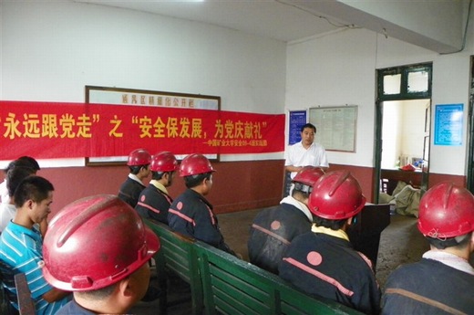 “安全保发展 为党庆献礼”暑期社会实践团走进安徽淮北市杨庄煤矿通风区参加班前会,学习矿工的各项理论技能。
