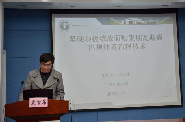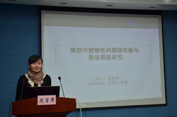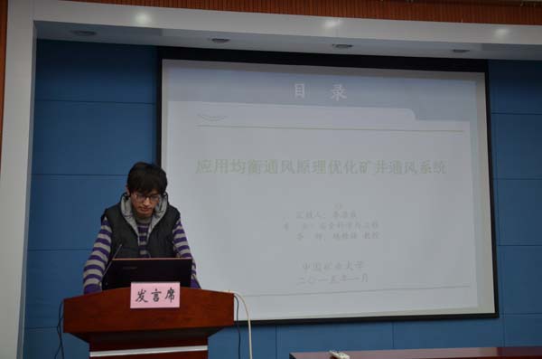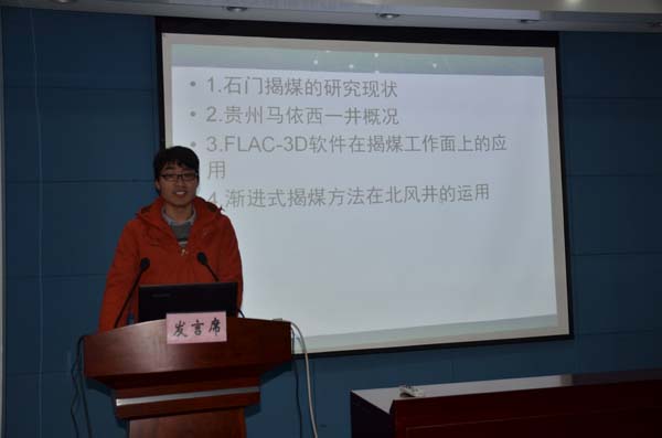 在经过主持人李俊毅的简短介绍后,来自2012级的研究生李浩威、韩宗建、蔡维维、谢兵兵、戴韬、焦汉林分别就各自的研究领域做了相关学术报告。首先由李浩威与大家分享他的研究成果,报告题目是“应用均衡通风原理优化矿井通风系统”,在他的报告中,以运河煤矿为例,结合均衡通风原理,向大家介绍了煤矿风网解算系统的设计与现状模拟研究。随后韩宗建向大家讲述了 “贵州马依西煤矿北风井揭煤防突技术研究”,介绍了如何将FLAC-3D软件应用在揭煤工作面上,同时介绍了渐进式揭煤方法在北风井的运用。蔡维维的报告题目是“薄型可燃物竖向燃烧实验与数值模拟研究”,她结合竖向燃烧火灾实验和数值模拟研究了薄型可燃物竖向燃烧规律。谢兵兵、戴韬和焦汉林的报告主题分别为“矿井通风自修复监测分析研究及应用”、“真实非均质岩石细观数值模型建立方法”和“初采期瓦斯涌出规律及治理技术研究”。