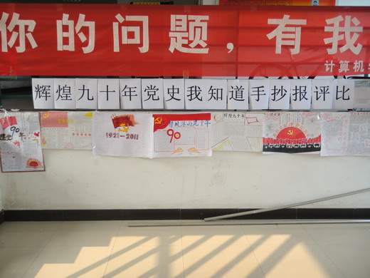 团委学生会组织、09级学生党支部、09级团总支联合举办的“辉煌九十年,党史我知道”手抄报征集活动圆满结束。5月8日,本次活动征集的优秀作品于梅苑二号楼大厅成功展出。