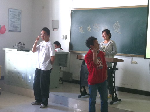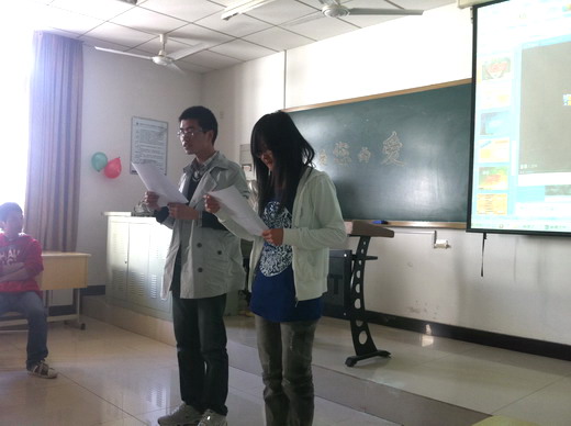 下午4点,“感受您的爱”主题活动准时开始。本次活动分为四个环节:爱的发现,爱的回顾,爱的生长及爱的永恒。主持人首先以一个故事为例引出主题,参加活动的同学对此发表感言,以此深化爱的发现这一环节;随后主持人带领同学们回忆父母平日对自己的关爱与呵护,使同学们深刻体会爱的珍贵。第三环节:同学们模拟父子通话,情节诙谐,体现父子之间看似平淡却真切的情感。最后,班会在爱的永恒环节中进入尾声,活动在同学们英文朗诵表达对父母的感恩中圆满落幕。