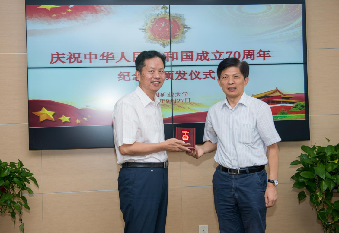 周世宁、王德明、林柏泉、程远平、王恩元、周福宝、秦波涛、翟成等8位教授获得了由中共中央、国务院、中央军委联合颁发的“庆祝中华人民共和国成立70周年纪念章”。宋学锋校长分别为在校的周世宁院士、林柏泉教授、程远平教授和翟成教授发放了纪念章。