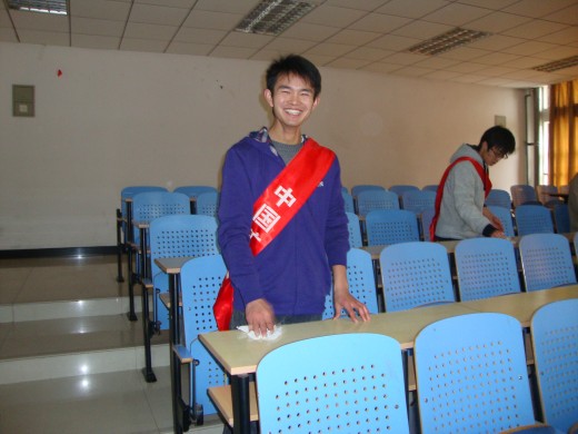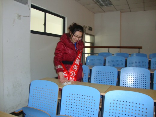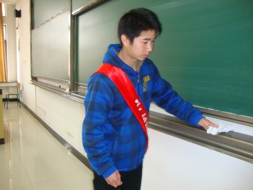 分队所分配到的教一A101~A103。程龙彪将队员分成三组到三个教室进行清扫。队员们工作热情很高,检查了桌面每一个角落,清理每一块污迹,坚决不留下一块斑渍。E组队员李刚更是不顾粉笔灰的漂浮,一丝不苟地把讲台和黑板槽打扫干净。