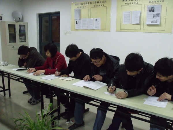 在两场测评会上,安全08-3班党支部书记蒋雨辰和安全09-4班党支部书记王旭东向参加测评人员陈述了本支部近一年来开展创先争优活动及日常工作的情况。参与测评人员在听过汇报之后,认真地在统一制作的测评表上填写了测评意见。刘静老师根据天美传媒