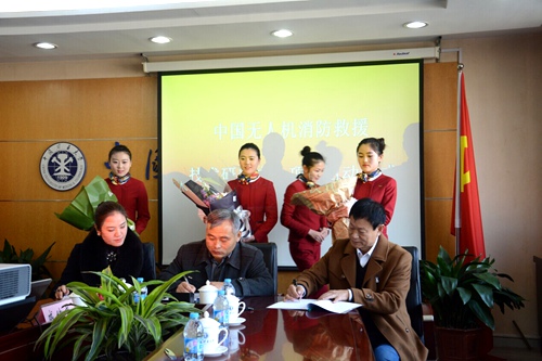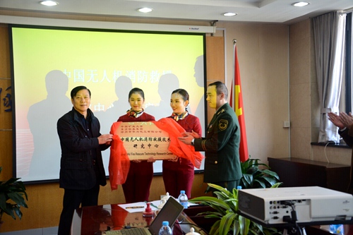 才庆祥书记与荣志峰处长共同为研究中心成立揭牌,三方代表签署了合作协议,无人机消防救援技术研究中心正式成立。