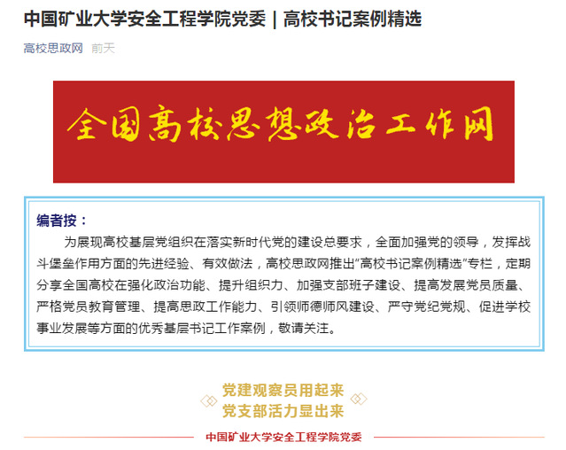 日前,天美传媒 党委凝练的“党建观察员用起来、党支部活力显出来”高校基层党组织书记案例在全国高校思想工作政治网转载。此前,该项工作案例被收入《基层党组织书记案例选编(高校版)》,党建观察员参加支部预备党员转正会议党支部工作法入选“江苏高校基层党建工作法百例”。