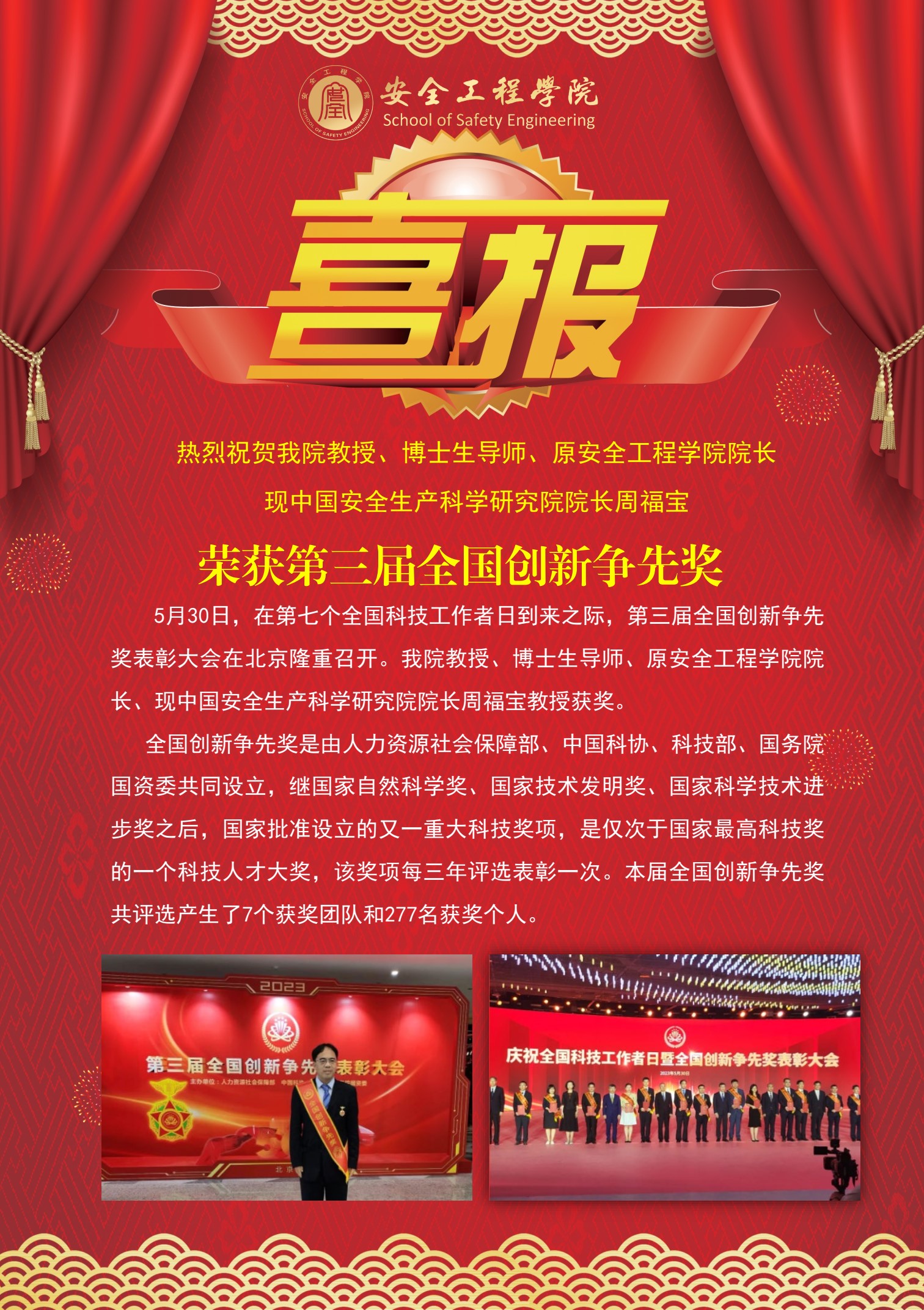 热烈祝贺天美传媒 教授、博士生导师、原天美传媒 院长、现中国安全生产科学研究院院长周福宝教授荣获第三届全国创新争先奖