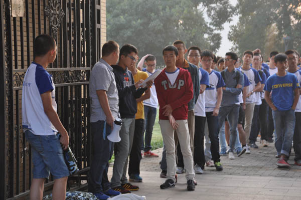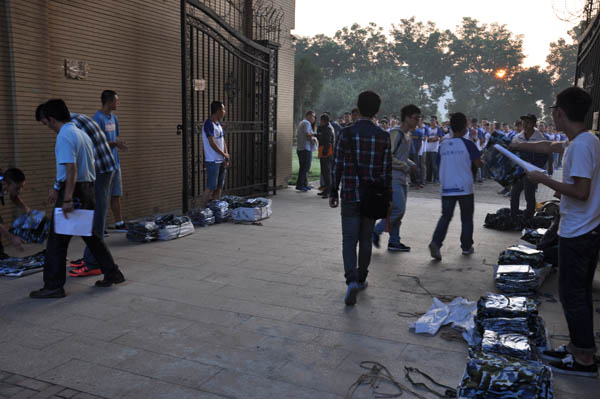 军训乃开学第一课,是新生生活的重头戏,也是新生进行身份转换的一个重要过渡。在13级学生干部的组织下,新同学们都满怀期待的来到了竹三东门。在老师和学生干部的组织,14级同学开始有序的领取军训服装,T恤,裤子,外套,帽子,鞋子,一样都不能落下,每个人在拿到自己的服装后都会仔细的清点一遍。同学们拿着整齐划一的服装,迎着朝阳,憧憬着军训期间每人都穿着绿色军装,走着整齐队列的景象。